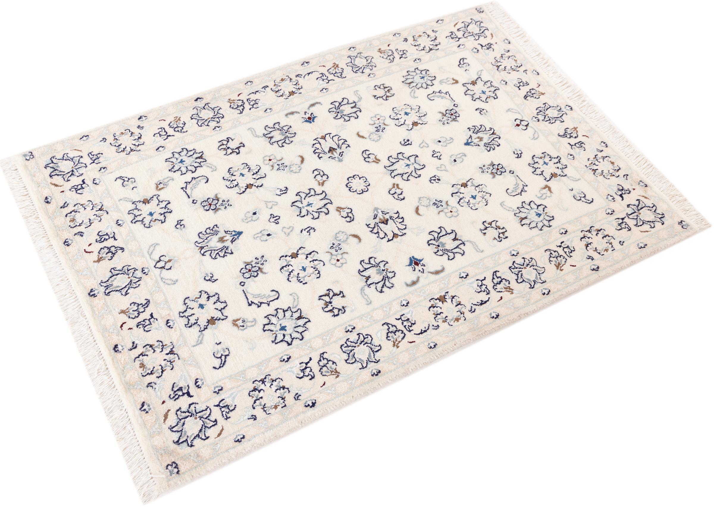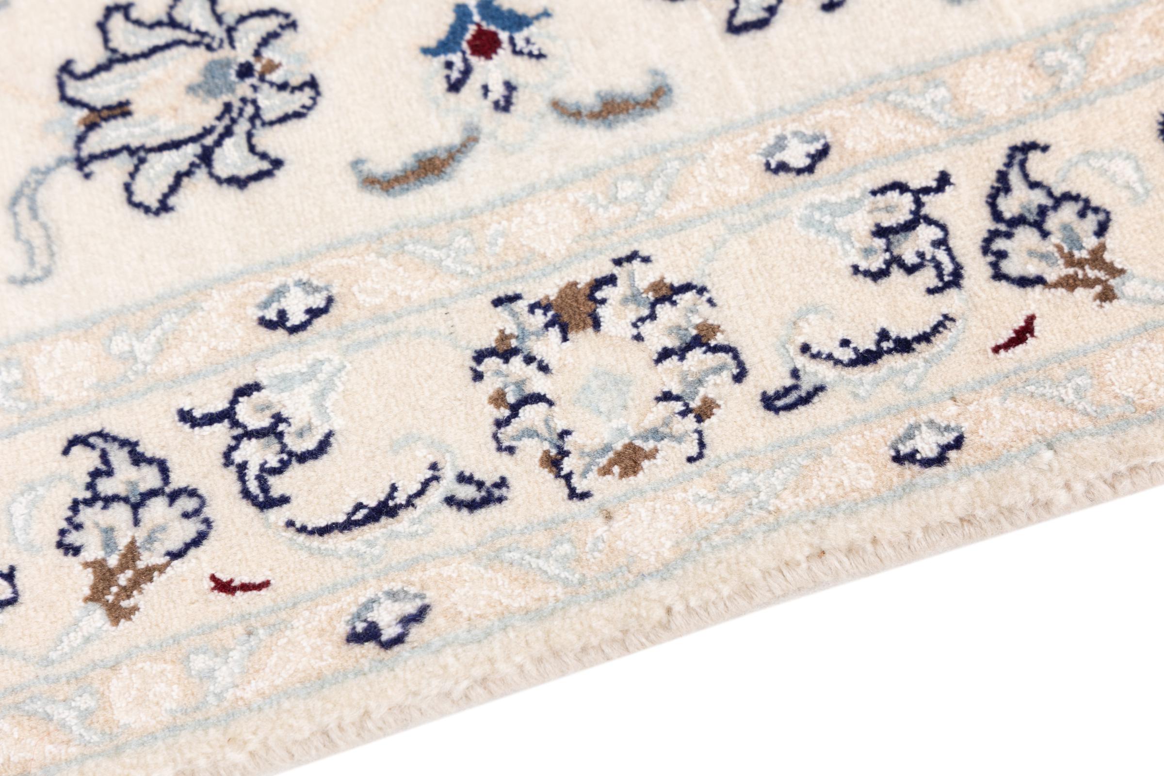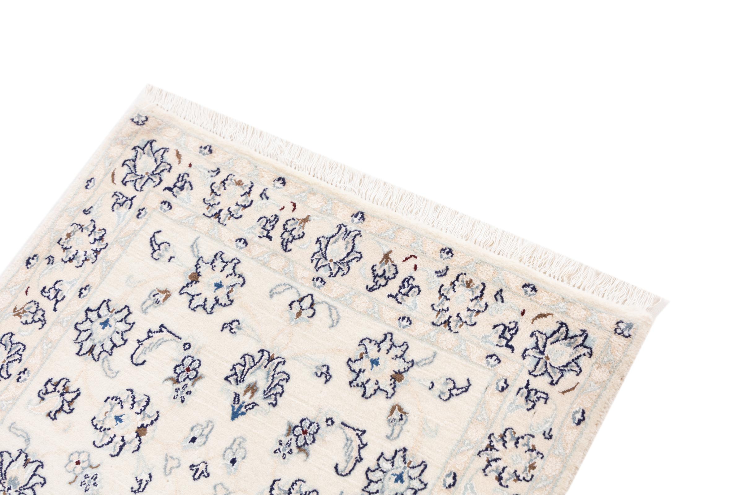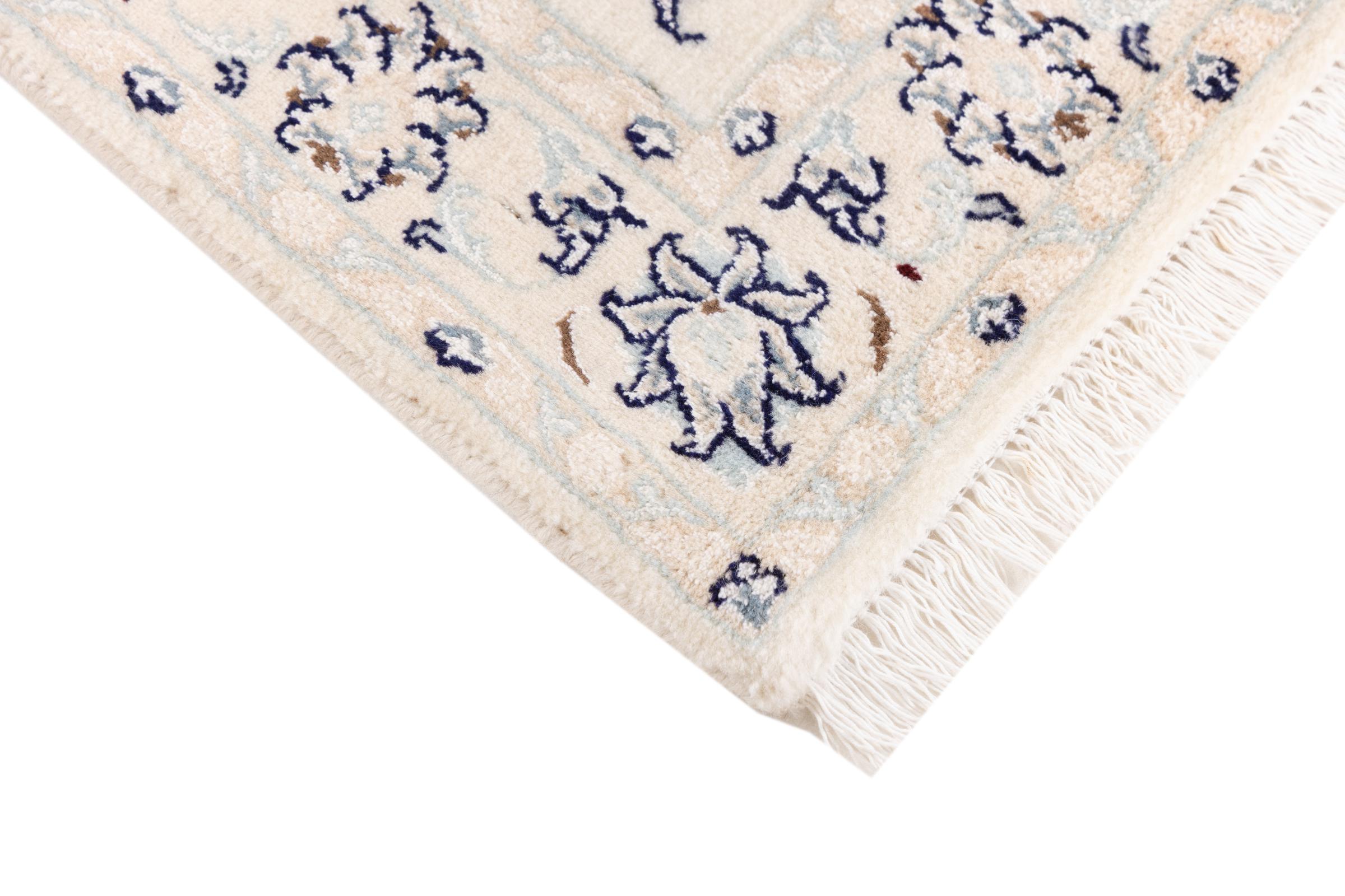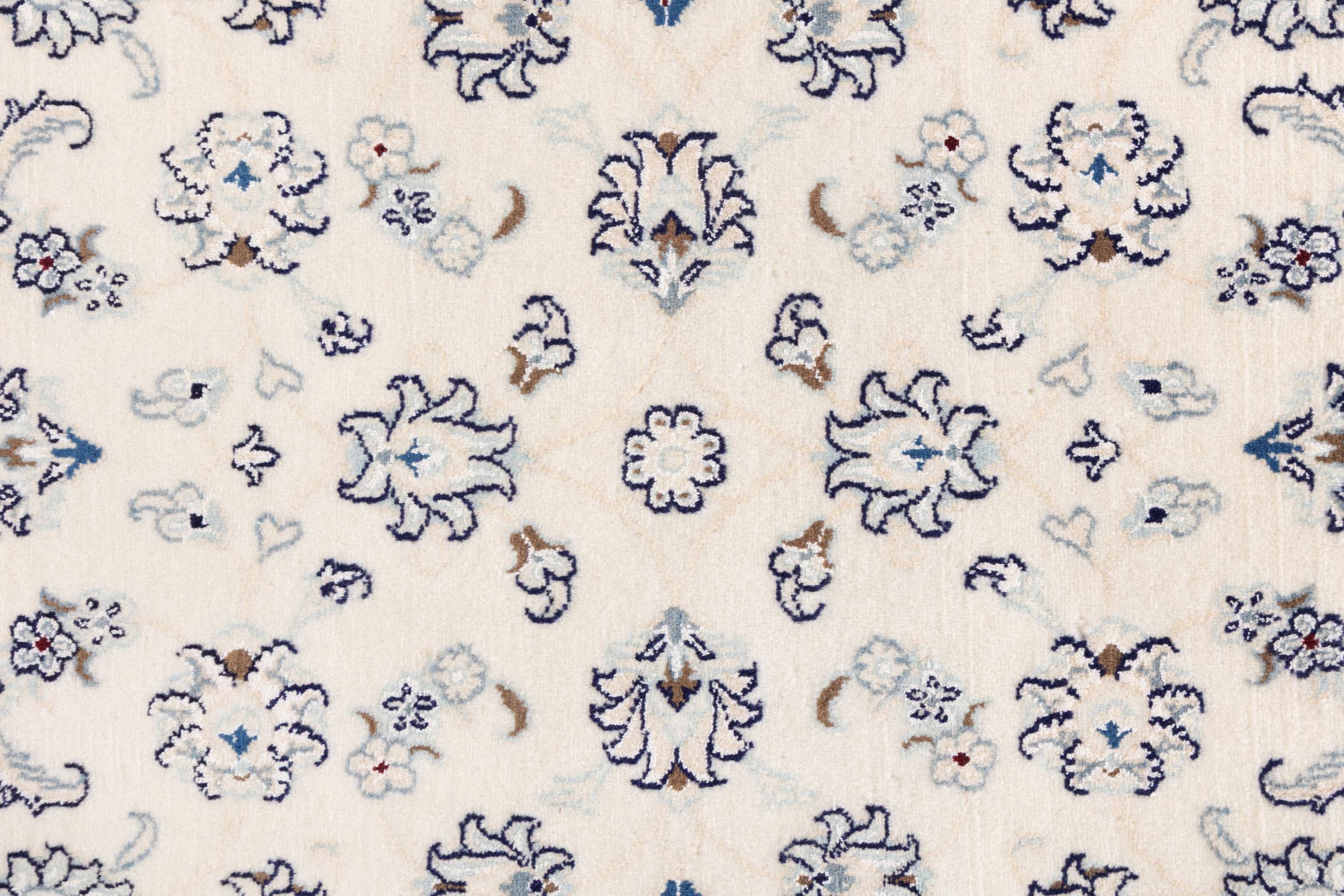 Ez a Nain szönyeg, mint 9La minösített. A kiváló minöség, a szép dizájn, a kanyargós minták minden vevöt elbüvölnek. Ez a Perzsa szönyeg nevével azonos városból Nain-ból, mely a Dascht-e-Kavir sivatag nyugati szélén fekszik, magas minöségü gyapjúból és természetes selyemböl készült.
