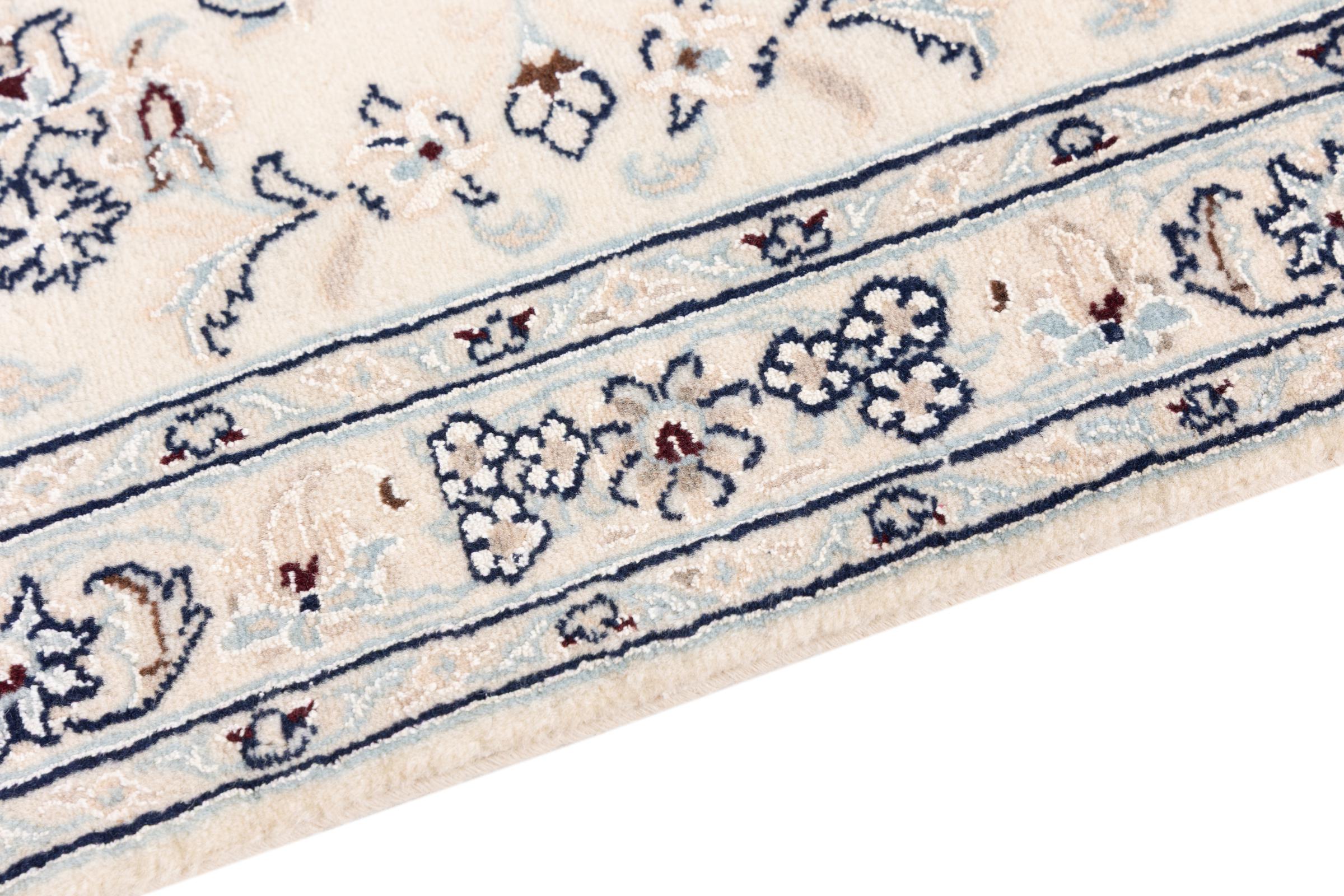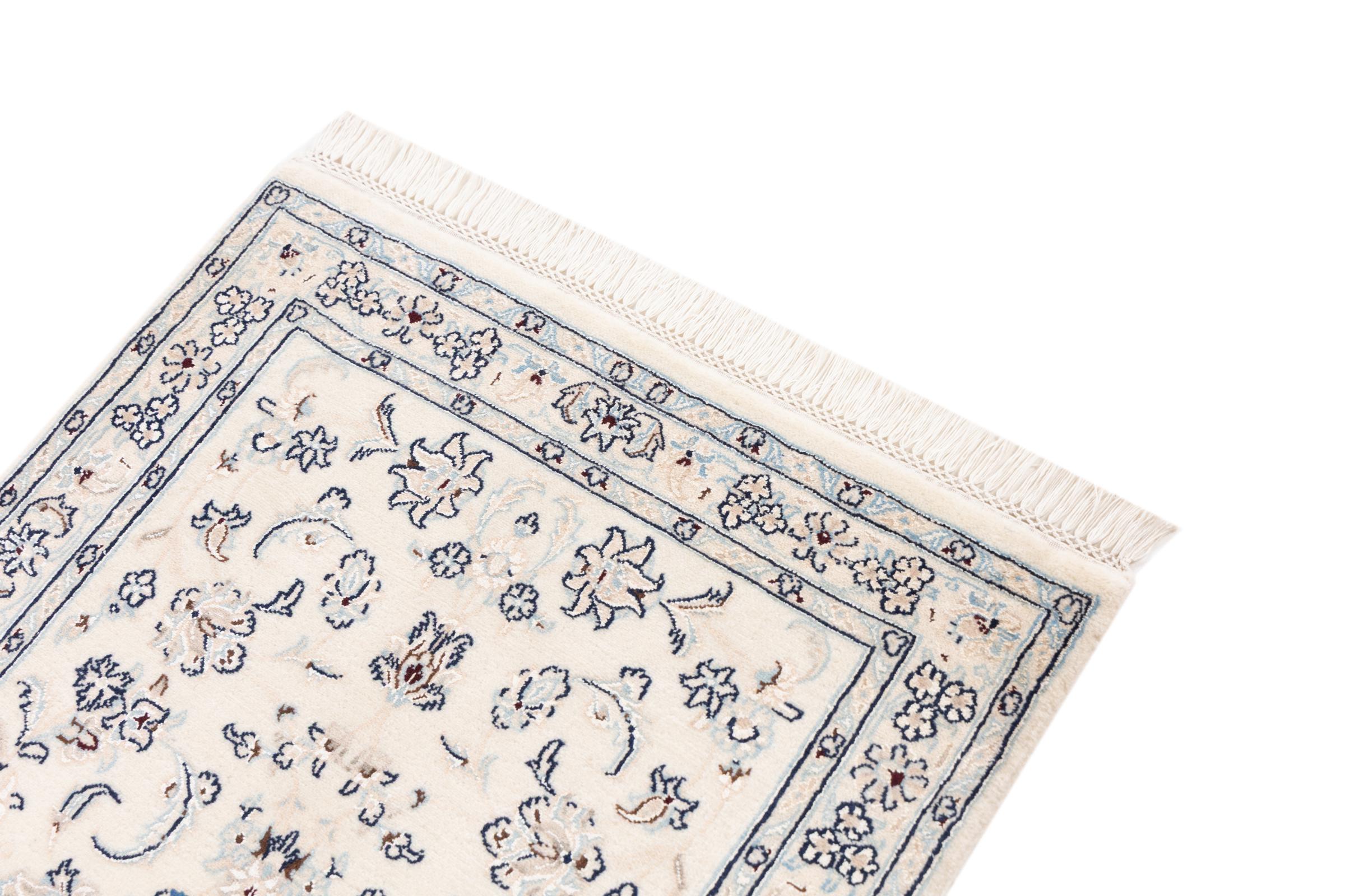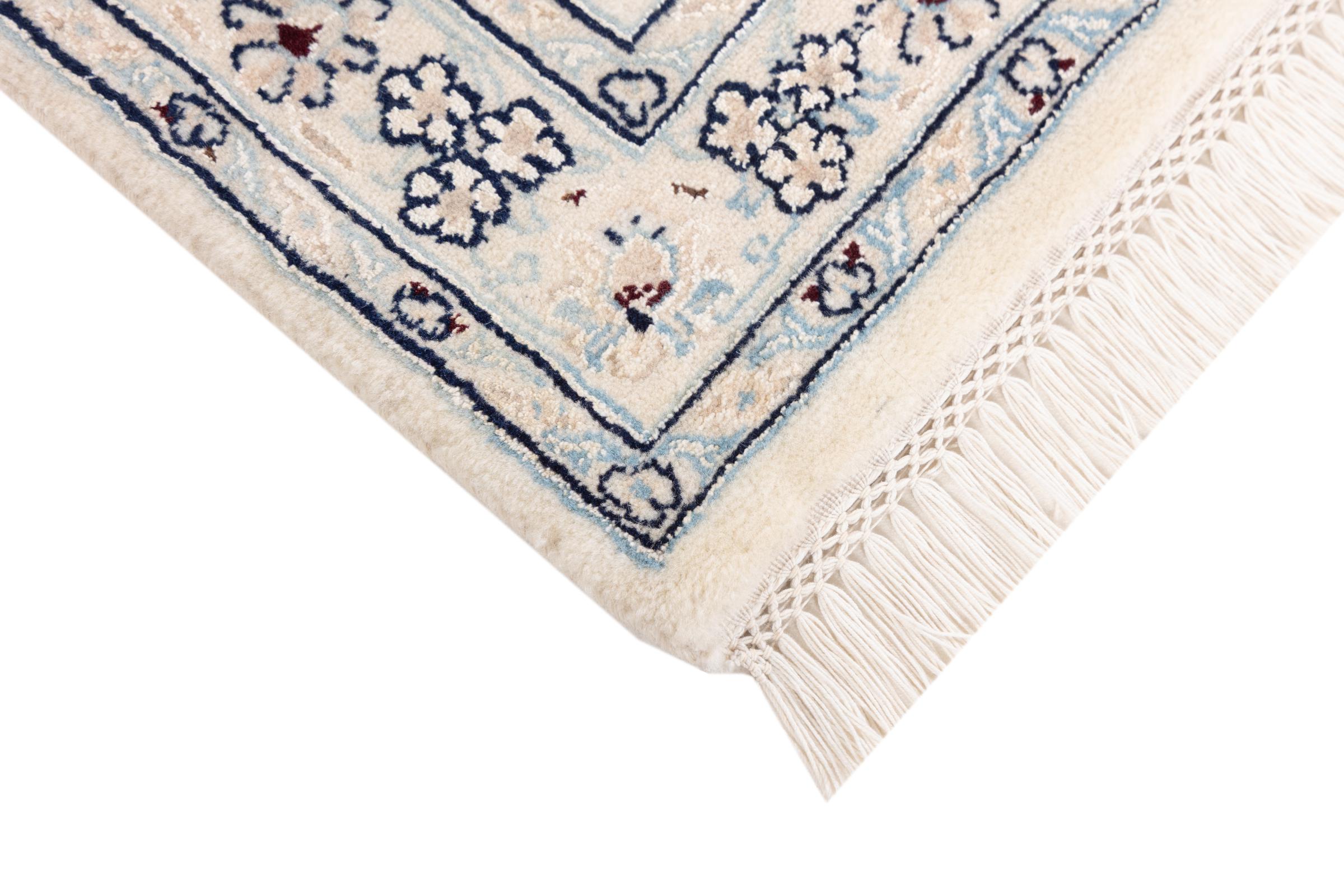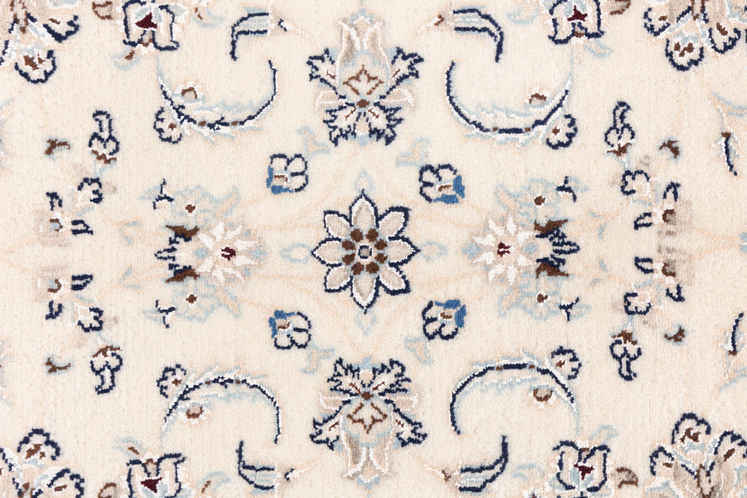 Ez a Nain szönyeg, mint 9La minösített. A kiváló minöség, a szép dizájn, a kanyargós minták minden vevöt elbüvölnek. Ez a Perzsa szönyeg nevével azonos városból Nain-ból, mely a Dascht-e-Kavir sivatag nyugati szélén fekszik, magas minöségü gyapjúból és természetes selyemböl készült.