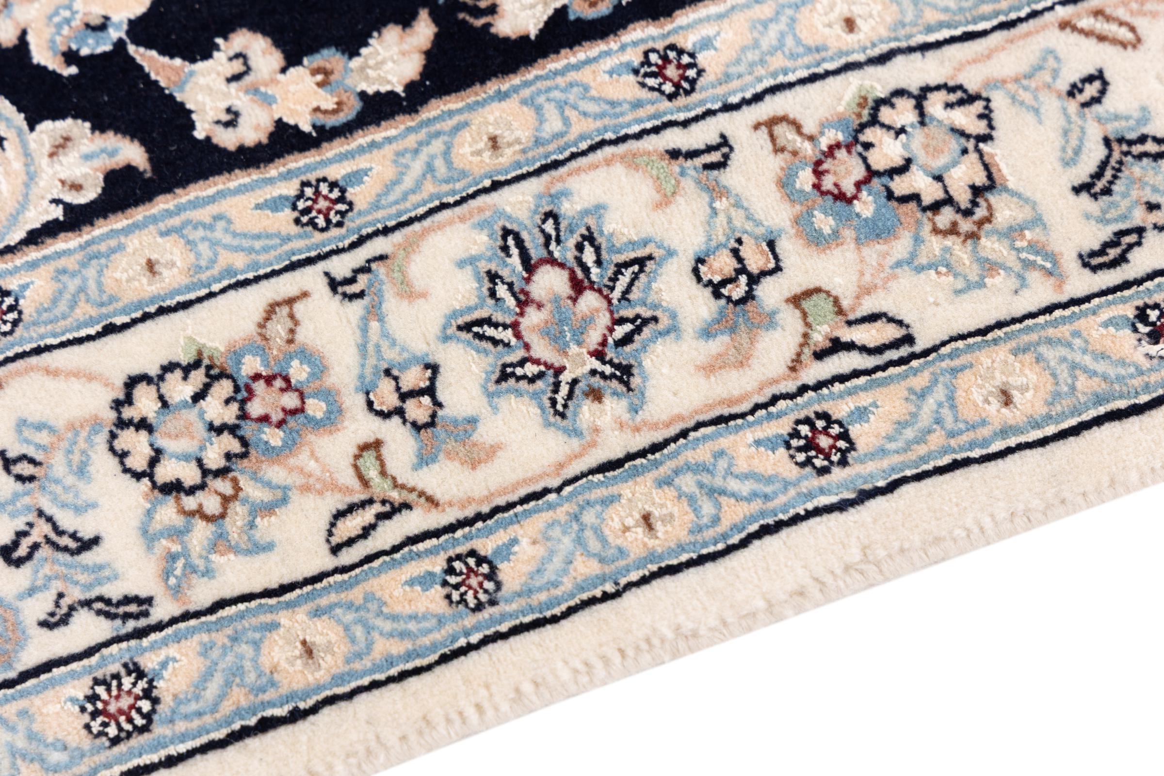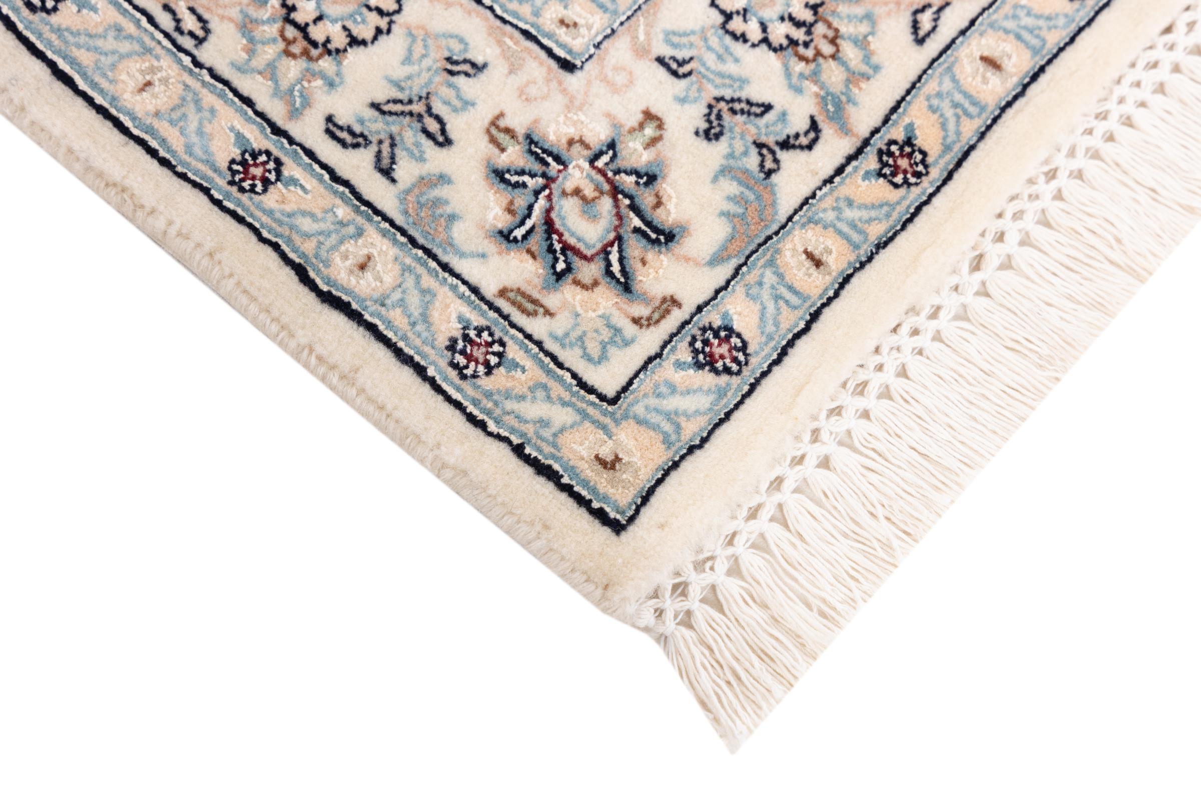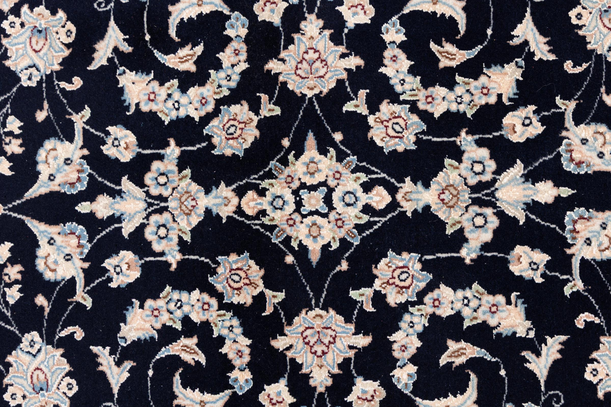 Ez a Nain szönyeg, mint 9La minösített. A kiváló minöség, a szép dizájn, a kanyargós minták minden vevöt elbüvölnek. Ez a Perzsa szönyeg nevével azonos városból Nain-ból, mely a Dascht-e-Kavir sivatag nyugati szélén fekszik, magas minöségü gyapjúból és természetes selyemböl készült.