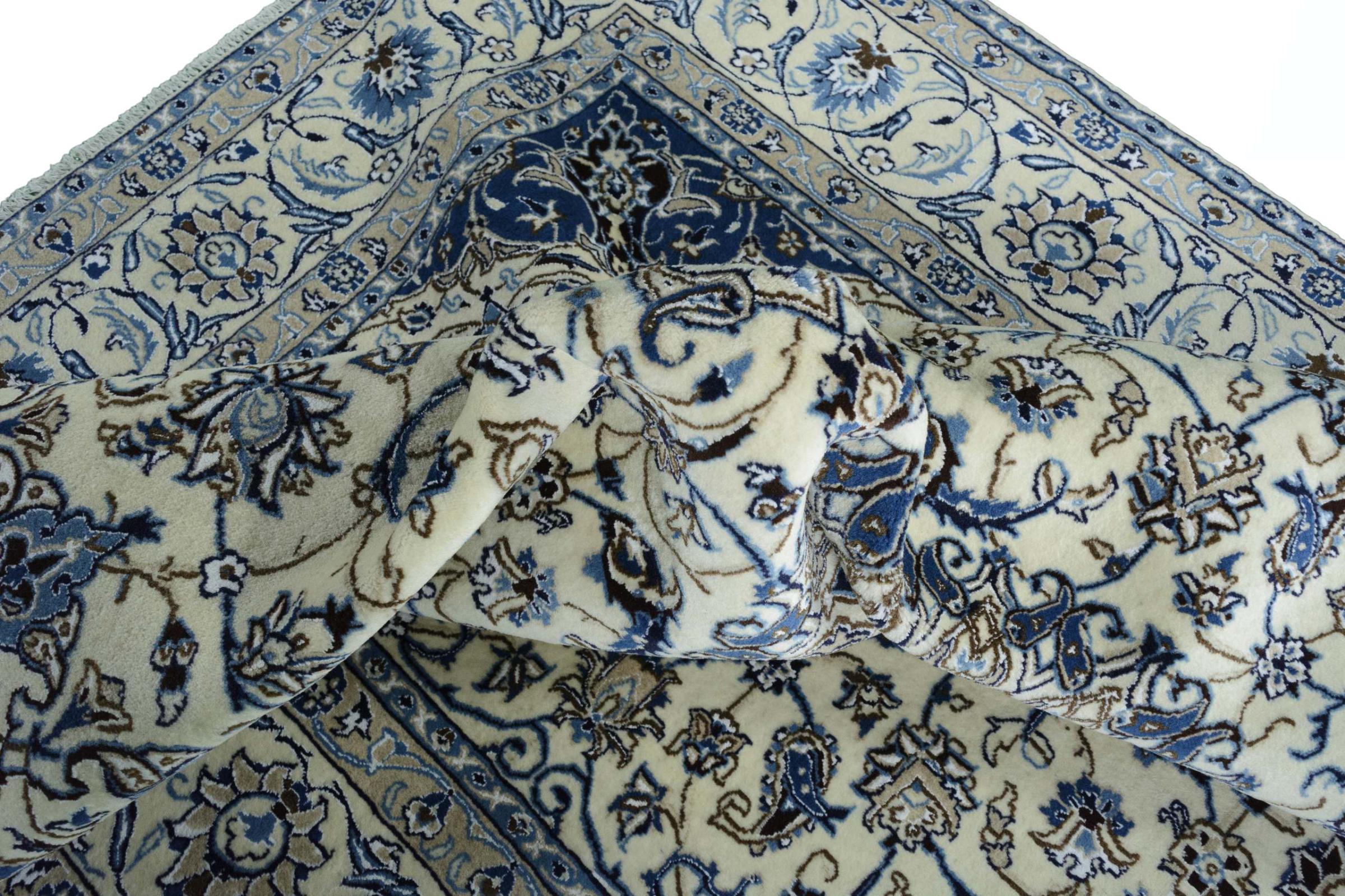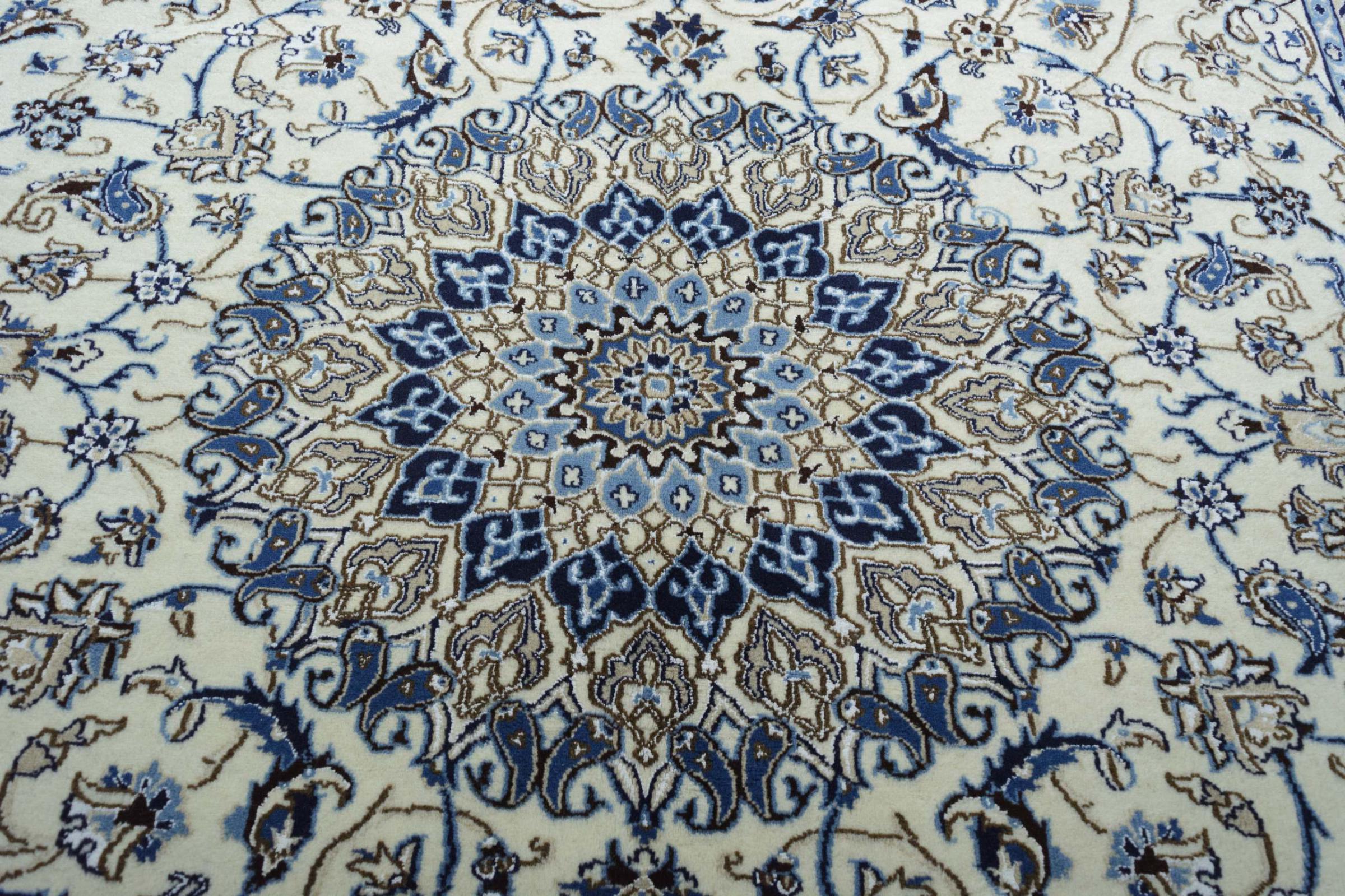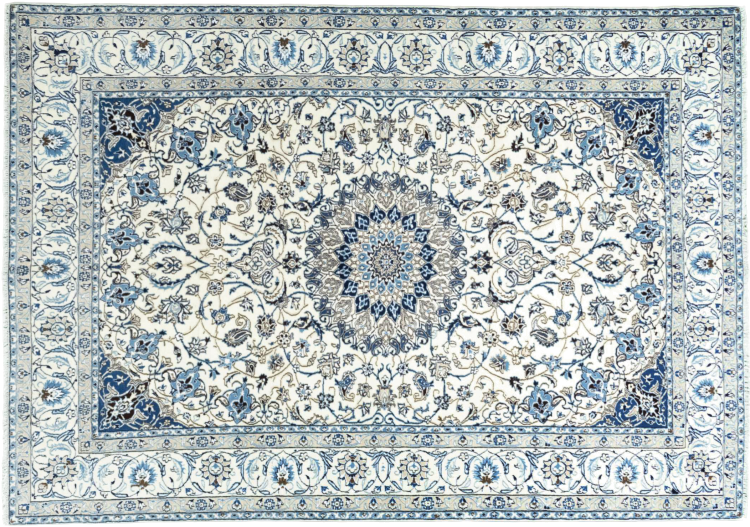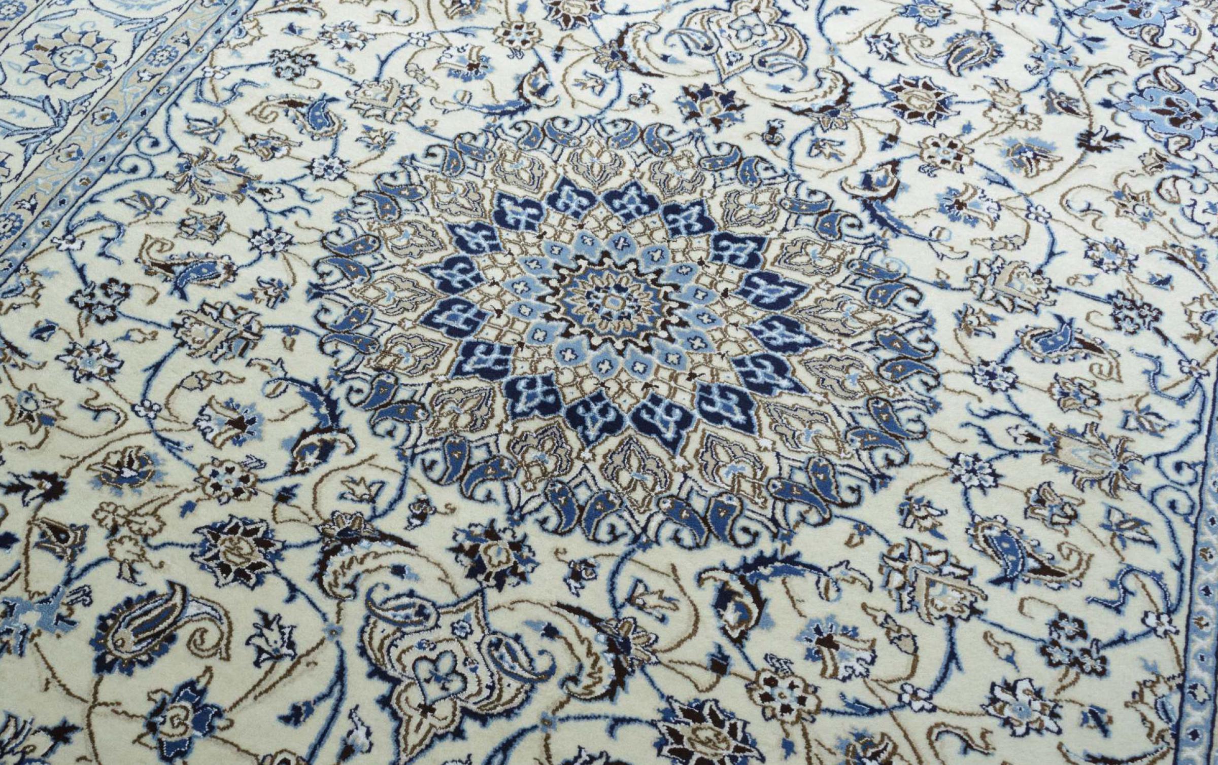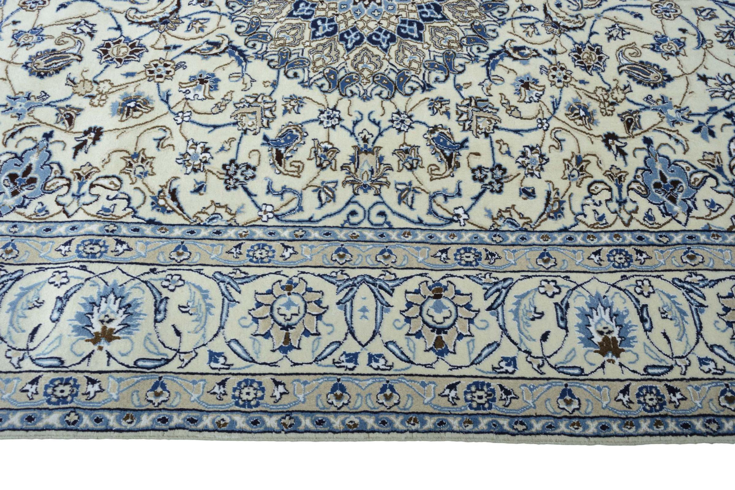 Ez a Nain szönyeg, mint 9La minösített. A kiváló minöség, a szép dizájn, a kanyargós minták minden vevöt elbüvölnek. Ez a Perzsa szönyeg nevével azonos városból Nain-ból, mely a Dascht-e-Kavir sivatag nyugati szélén fekszik, magas minöségü gyapjúból és természetes selyemböl készült.