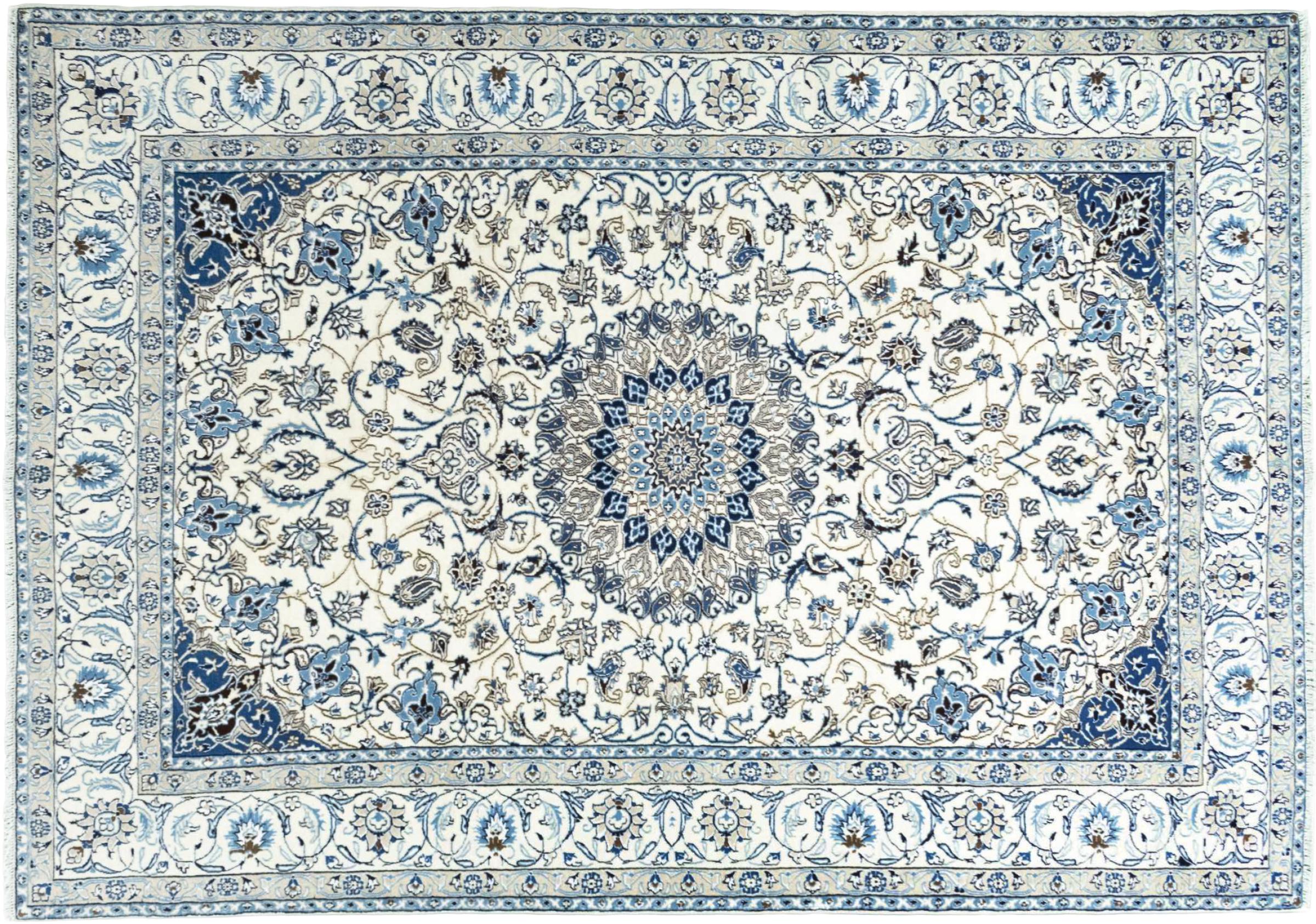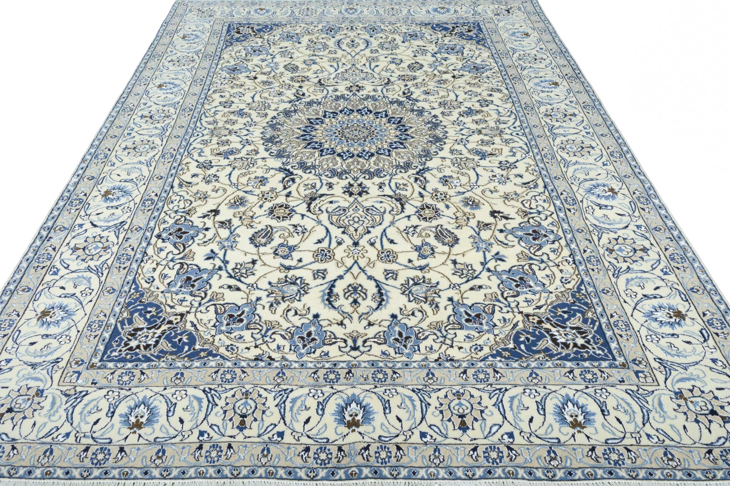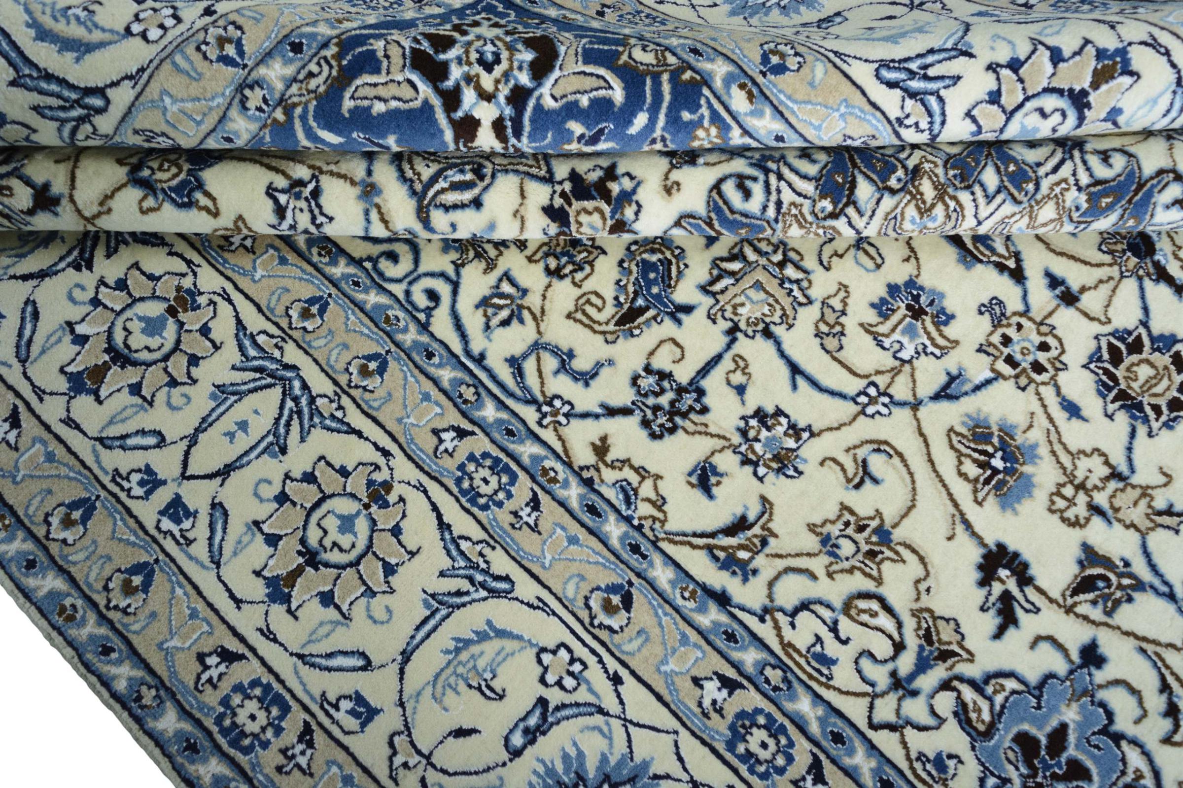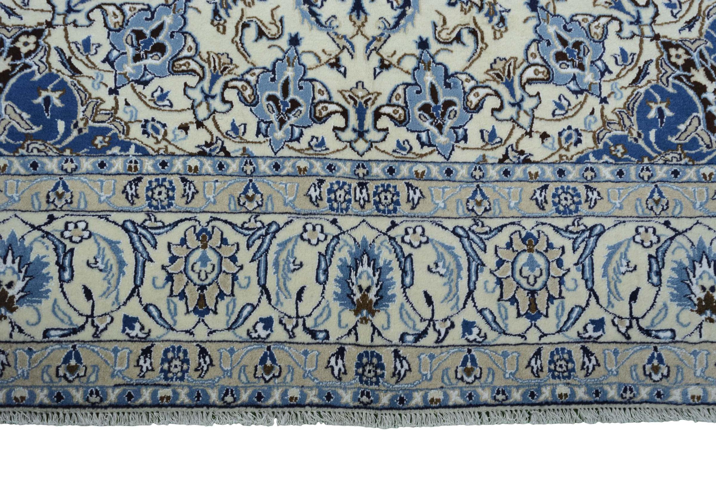 Ez a Nain szönyeg, mint 9La minösített. A kiváló minöség, a szép dizájn, a kanyargós minták minden vevöt elbüvölnek. Ez a Perzsa szönyeg nevével azonos városból Nain-ból, mely a Dascht-e-Kavir sivatag nyugati szélén fekszik, magas minöségü gyapjúból és természetes selyemböl készült.