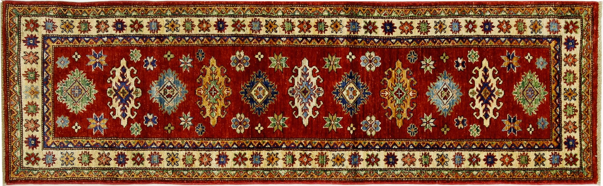 A Kazak területi szőnyegek tartós, élénk gyapjúszőnyegek, amelyek egyedi geometriai mintáikról, kiegyensúlyozott színeikről és kivételes kivitelezésükről ismertek. Lebilincselő és kulturálisan gazdag légkört teremtenek terében. Eredetileg a Kaukázusból származnak, és az egyik legrégebbi fajta szőnyeg, ma főként kazahok készítik Afganisztánban és Pakisztánban. Egy antik kazak szőnyeg nagyon értékes lehet a gyűjtők számára.